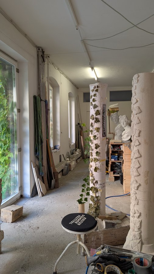Die Remisen im 4. Hof waren in den alten Plänen des Gebäudes noch die „Pferdeställe“. 1992 beim Kauf des Grundstücks waren sie nicht mehr als ein paar Ruinen. Heute sind rund um den „Atelierhof“ drei Künstlerinnenateliers angeordnet. Im „Hilla Rebay Atelier“ arbeitet zur Zeit die Bildhauerin Konscha Schostak.